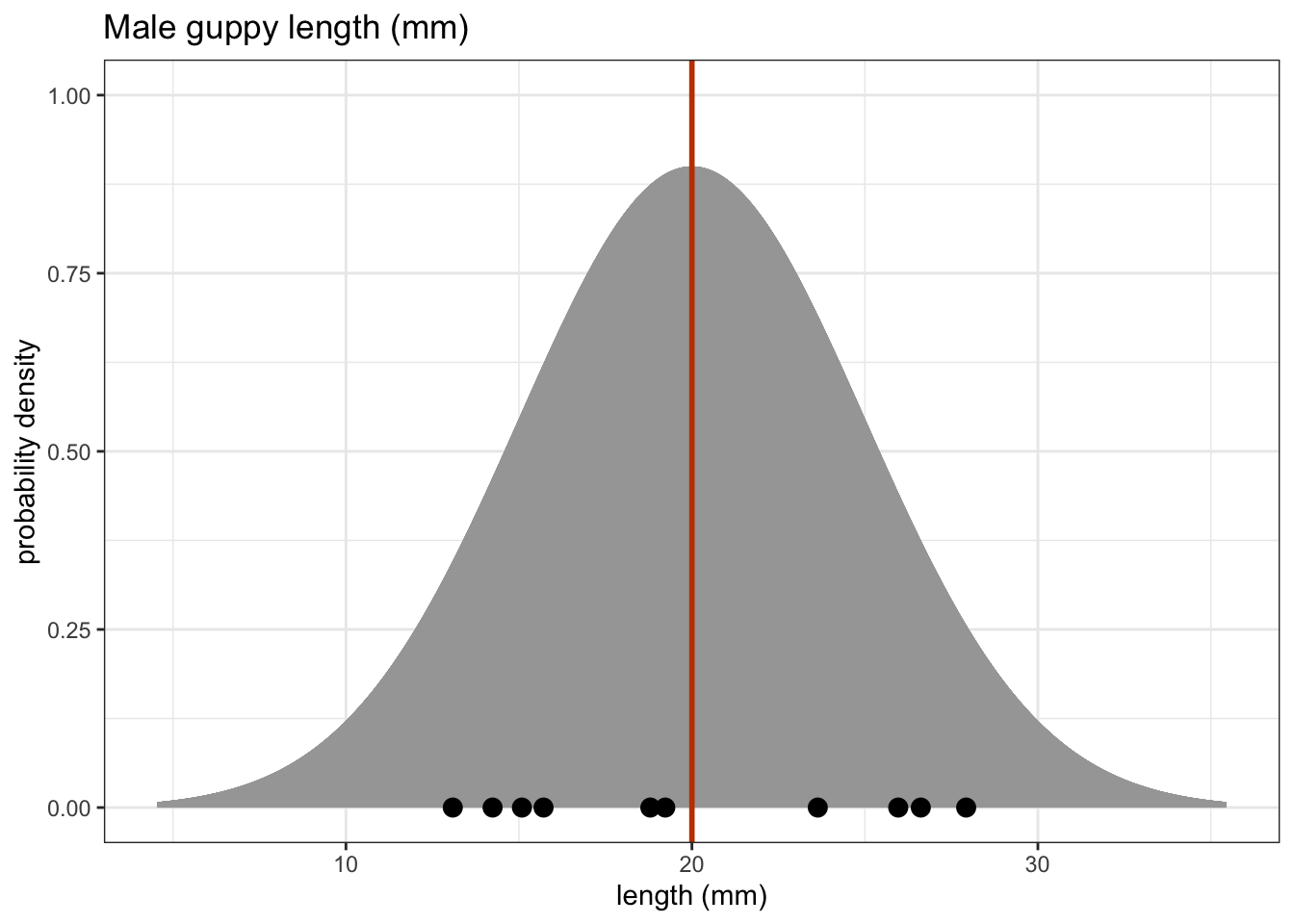 A one-sample t-test indicated that the mean body length of male guppies (\(\bar{x}\) = 18.29mm) differs significantly from 20 mm (p = 0.0014).