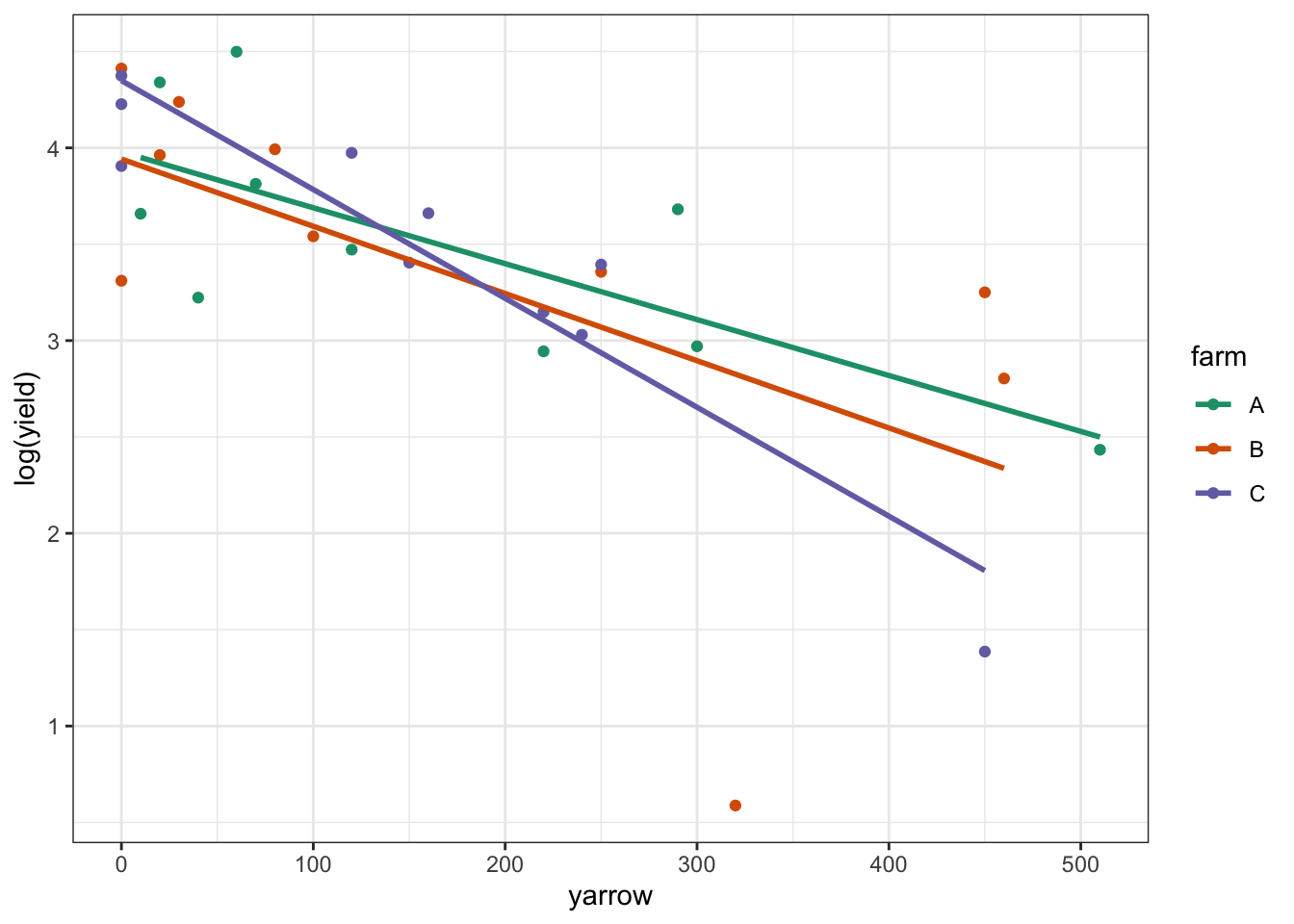 - Is there any interaction between the two predictor variables? Here an interaction would display itself as a difference in the slopes of the regression lines for each group, so for example perhaps the conifer data set has a significantly steeper line than the broad leaf woodland data set.