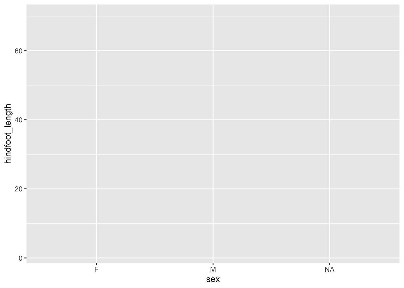 is that it builds up the plot layer-by-layer. We don’t even have to provide it with a geometry to start with and it’ll still create the outline of a plot. Let’s illustrate this with another example, where we plot hindfoot_length