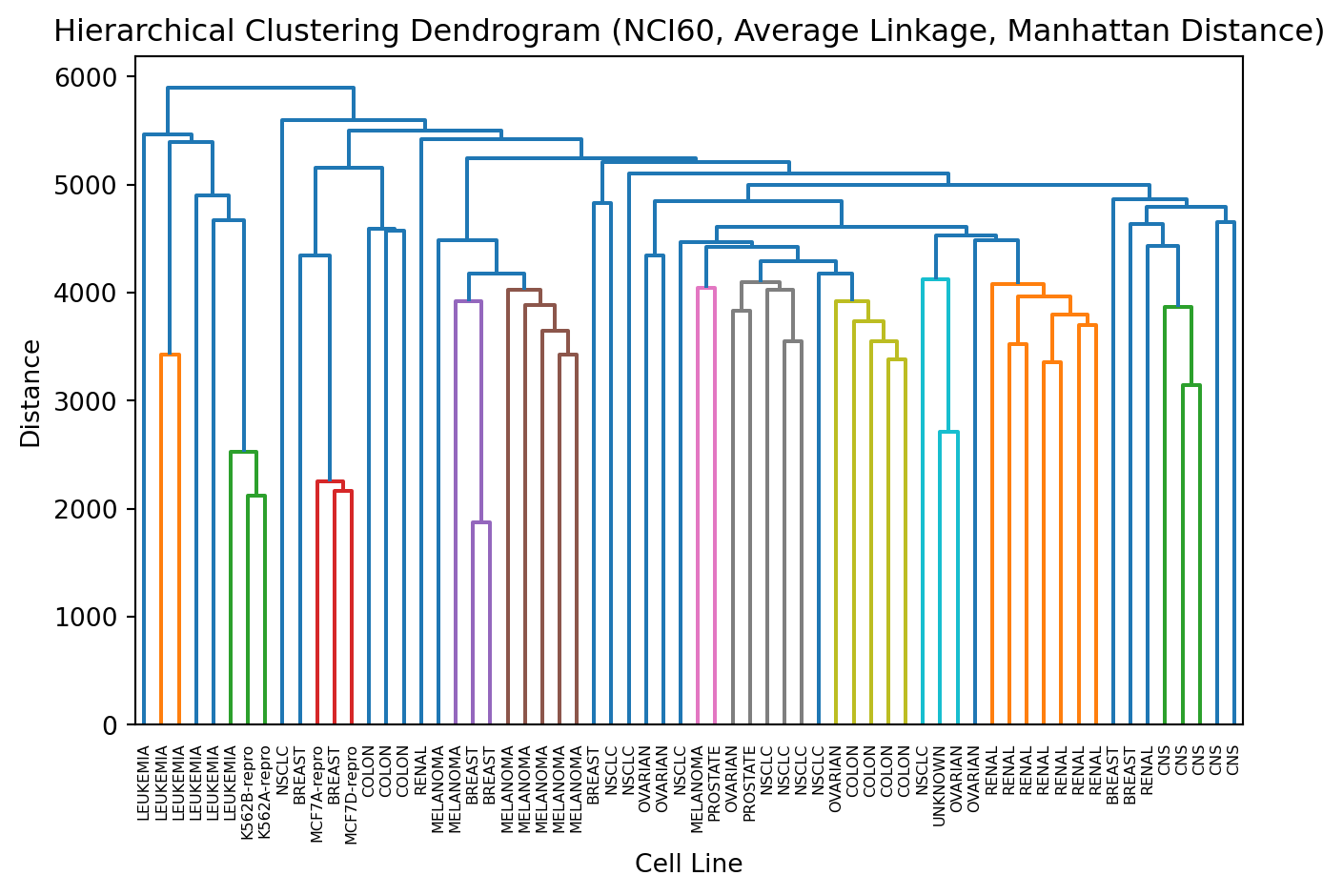 # Hierarchical Clusteringagg = AgglomerativeClustering(linkage='average', metric='manhattan')cluster_labels = agg.fit_predict(X)# Compute linkage matrix for the dendrogramZ = linkage(X, method='average', metric='cityblock')# Plot Dendrogramplt.figure()dendrogram(Z, labels=labs)plt.title('Hierarchical Clustering Dendrogram (NCI60, Average Linkage, Manhattan Distance)')plt.xlabel('Cell Line')plt.ylabel('Distance')plt.xticks(rotation=90)plt.tight_layout()plt.show()