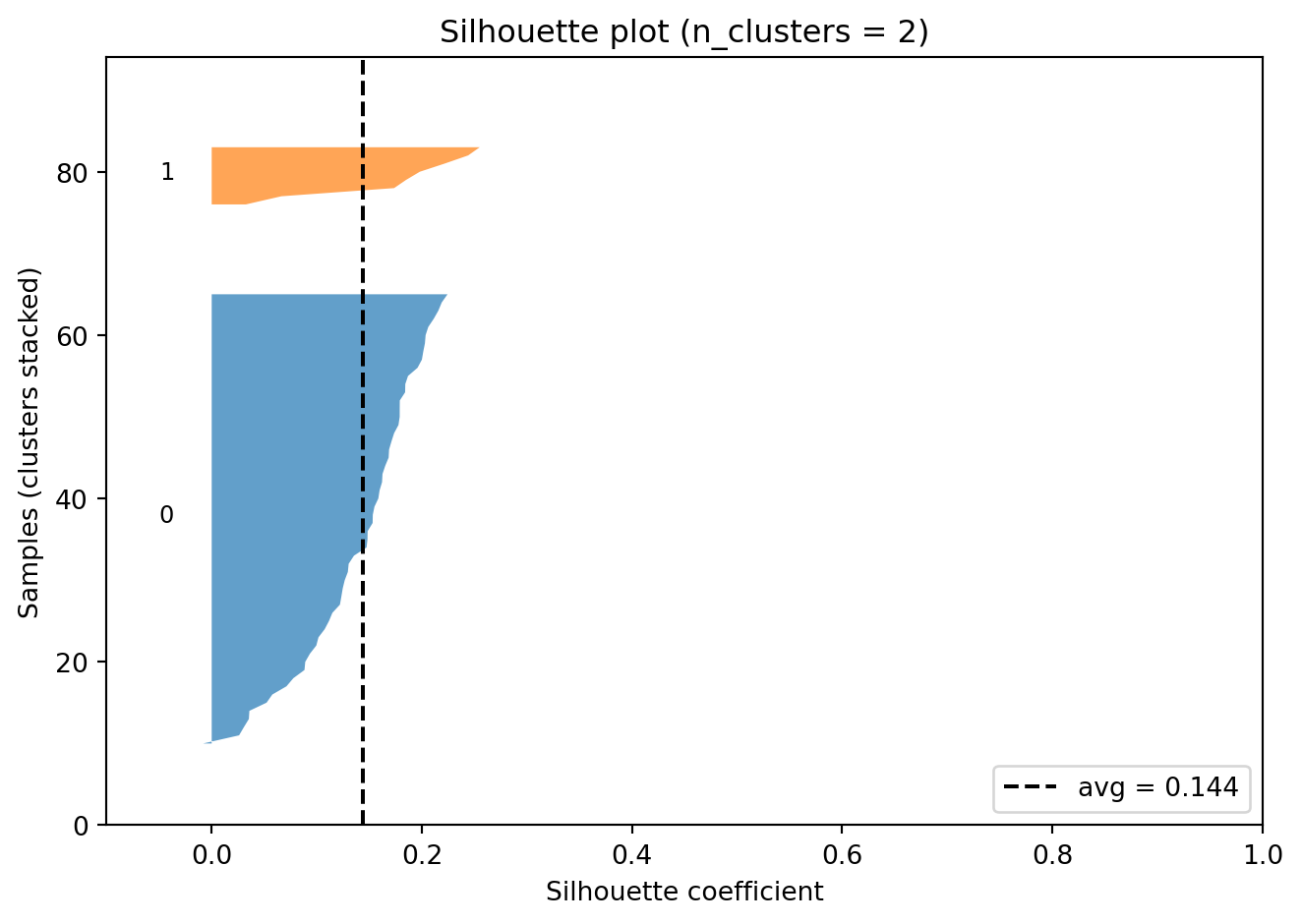 def plot_silhouette_simple(X, labels, metric='manhattan'):""" Minimal silhouette-bar plot. X : array-like, shape (n_samples, n_features) labels : array-like, cluster labels (integers) metric : distance metric for silhouette (use same metric as clustering) """ unique_labels = np.unique(labels) n_clusters =len(unique_labels)if n_clusters <2:print("Need at least 2 clusters to compute silhouette.")return# overall score s_score = silhouette_score(X, labels, metric=metric)print(f"Silhouette score: {s_score:.3f} (range -1 to 1; higher is better)")# per-sample silhouette values sample_vals = silhouette_samples(X, labels, metric=metric) plt.figure() y_lower =10# starting y position for first clusterfor i, cl inenumerate(unique_labels): vals = sample_vals[labels == cl] vals.sort() size = vals.shape[0] y_upper = y_lower + size# draw horizontal filled bars for this cluster plt.fill_betweenx(np.arange(y_lower, y_upper),0, vals, alpha=0.7)# cluster label at left plt.text(-0.05, y_lower +0.5* size, str(cl), va='center', fontsize=9) y_lower = y_upper +10# 10-pixel spacing between groups plt.axvline(x=s_score, color='k', linestyle='--', label=f'avg = {s_score:.3f}') plt.xlabel('Silhouette coefficient') plt.xlim(-0.1, 1.0) plt.ylabel('Samples (clusters stacked)') plt.title(f'Silhouette plot (n_clusters = {n_clusters})') plt.legend(loc='lower right') plt.ylim(0, y_lower) plt.tight_layout() plt.show()# Usage# from sklearn.cluster import AgglomerativeClustering# agg = AgglomerativeClustering(linkage='average', metric='manhattan')# cluster_labels = agg.fit_predict(X)plot_silhouette_simple(X, cluster_labels, metric='manhattan')