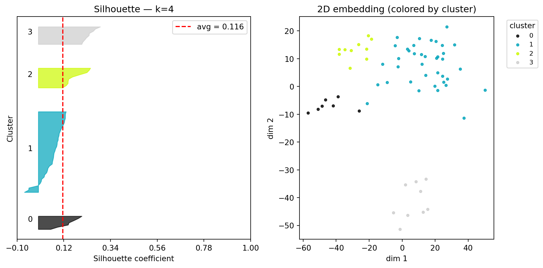 Mean silhouette ≲ 0.25 → little structure; clustering may be unreliable. (These are rules of thumb — context and domain knowledge matter.)