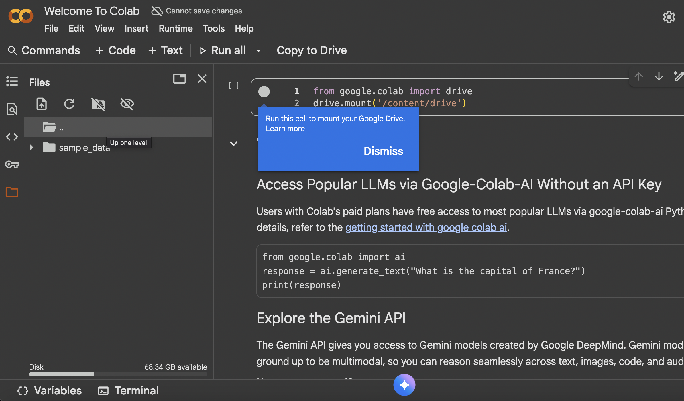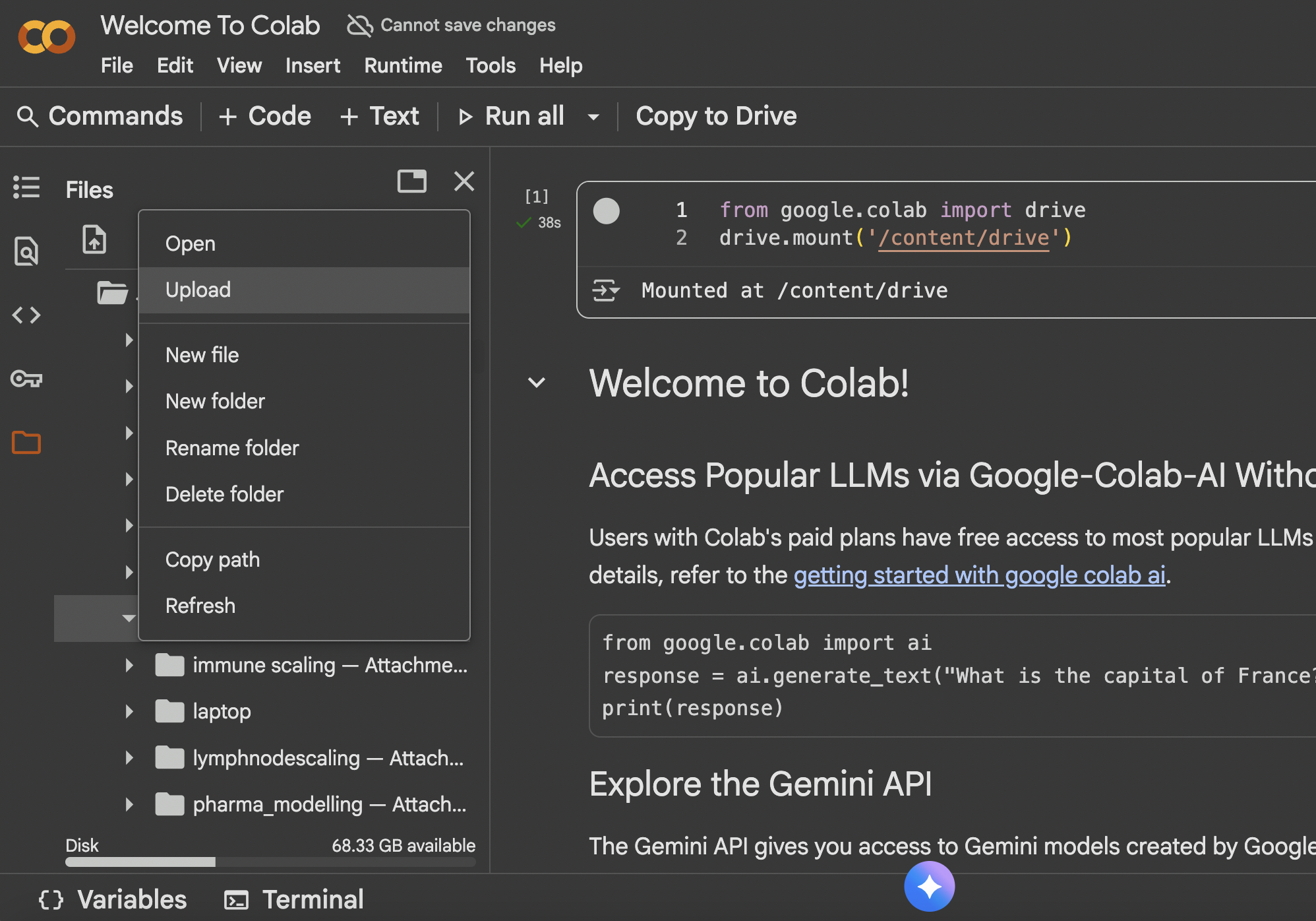 ) and mount the drive in Colab. Open a new Google Colab notebook. Then create a new code cell and type the following commands (and then click the play button to run the cell):