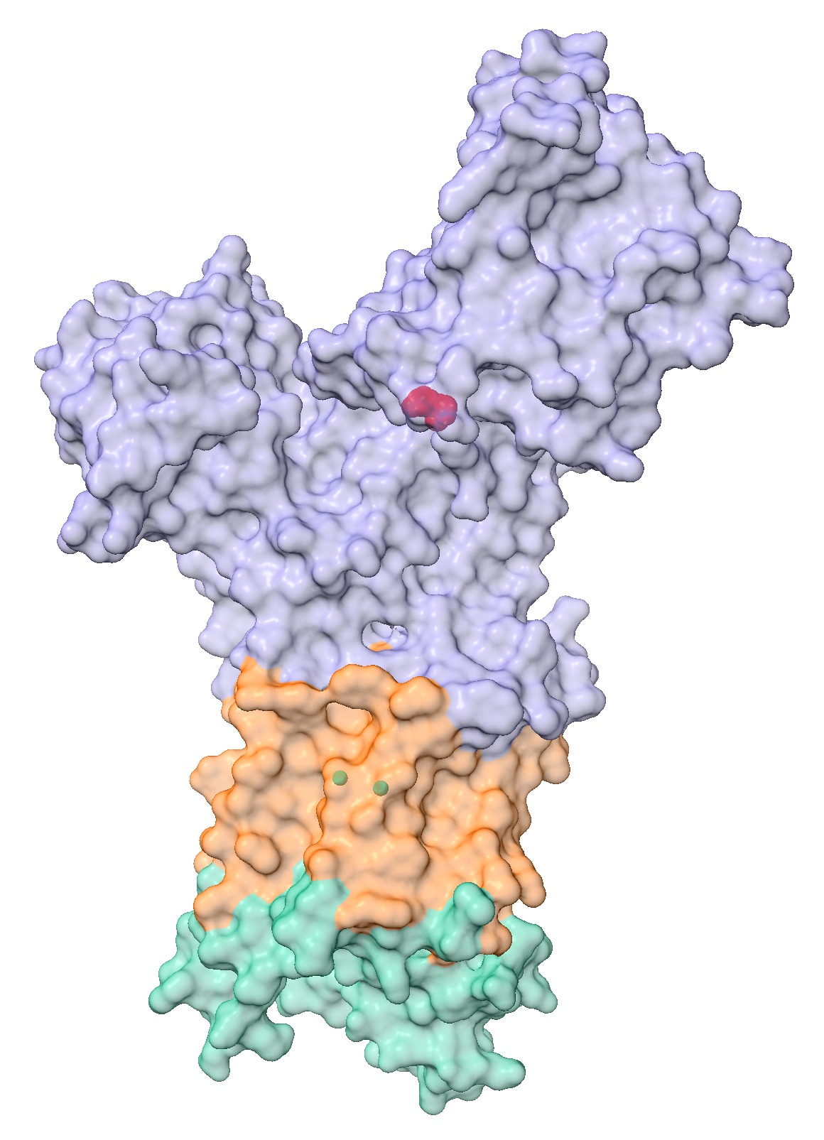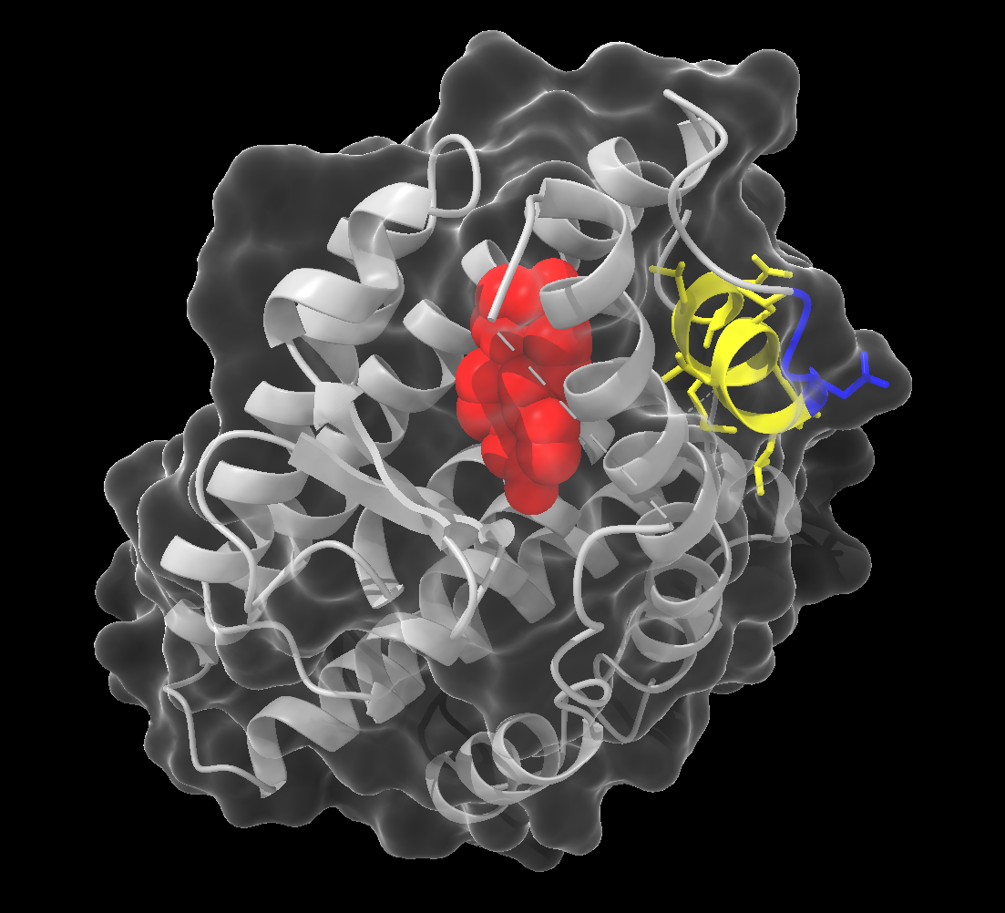 surface protein color white transparency 80This command creates a surface representation of the protein, coloured white with 80% transparency. We keep the cartoon representation, allowing us to view the secondary structure inside the surface.