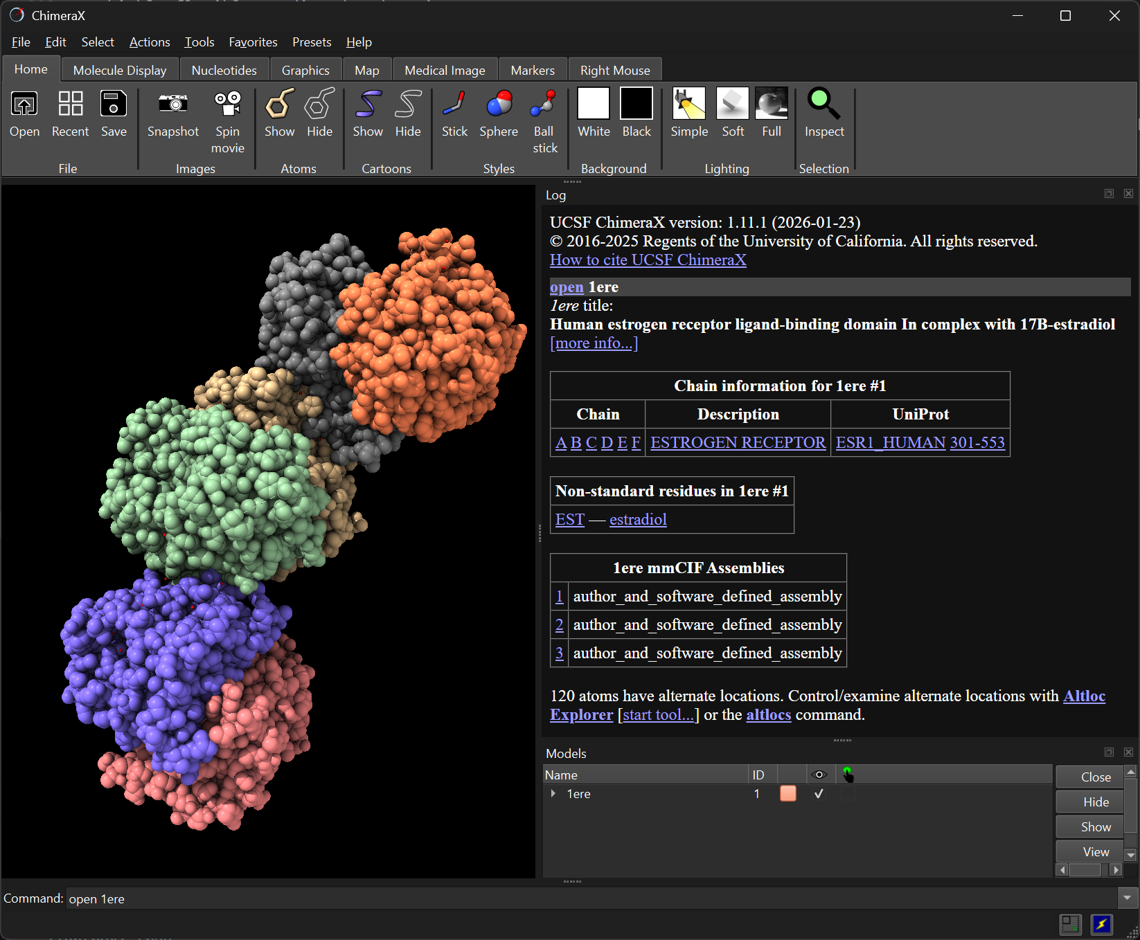 To open a PDB file from the command line, use open. For example, to load the ligand-binding domain of the human Estrogen Receptor (PDB: 1ERE):