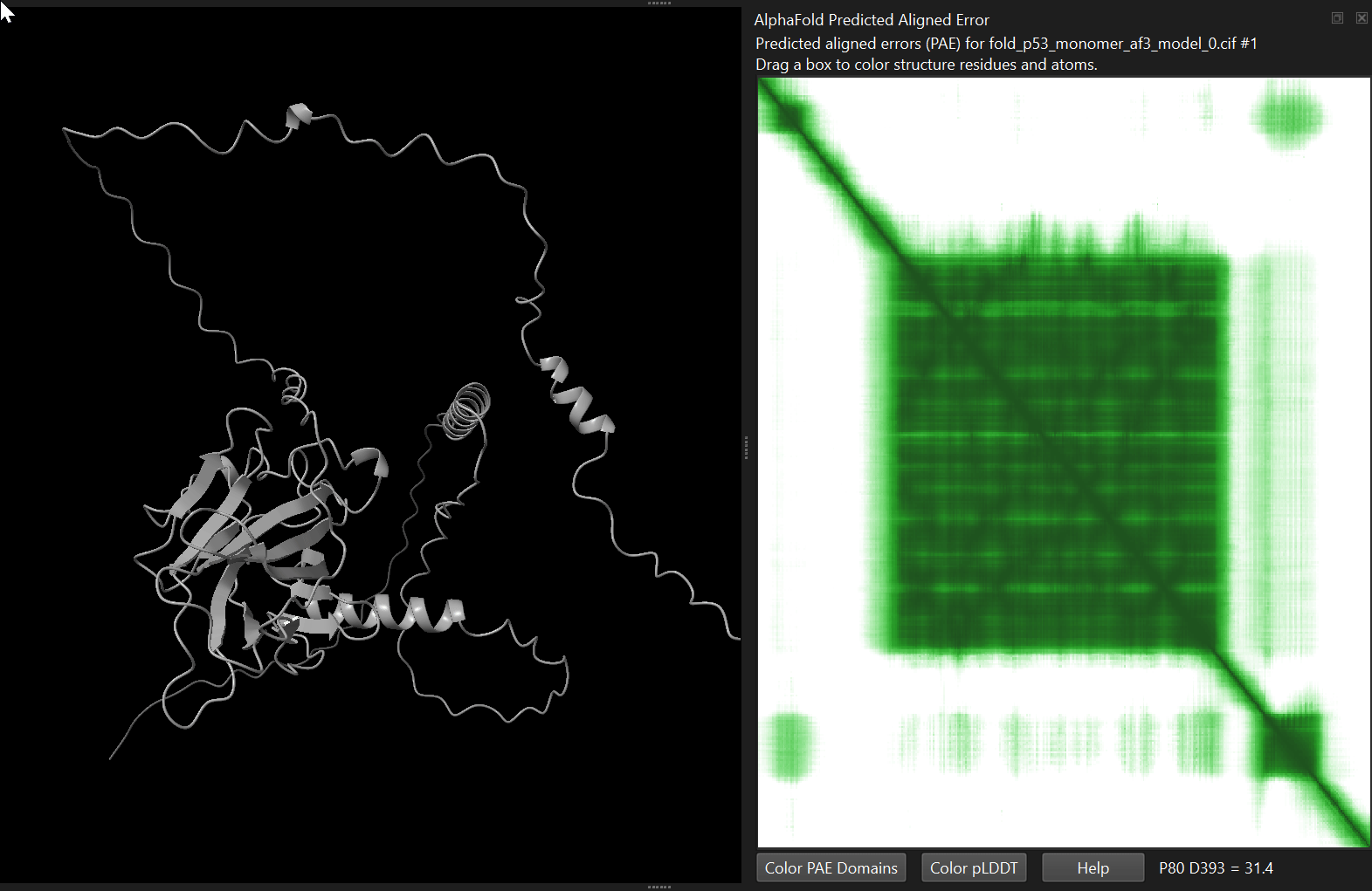 alphafold pae #1 palette paegreen file p53_human/p53_monomer_af3/fold_p53_monomer_af3_full_data_0.jsonalphafold pae #1 palette paegreen file p53_human/p53_monomer_af2/p53_monomer_af2_7c637_scores_rank_001_alphafold2_ptm_model_1_seed_000.jsonChimeraX will display the matrix as a heatmap. You can interactively select blocks on the heatmap, which will get highlighted in the structure.