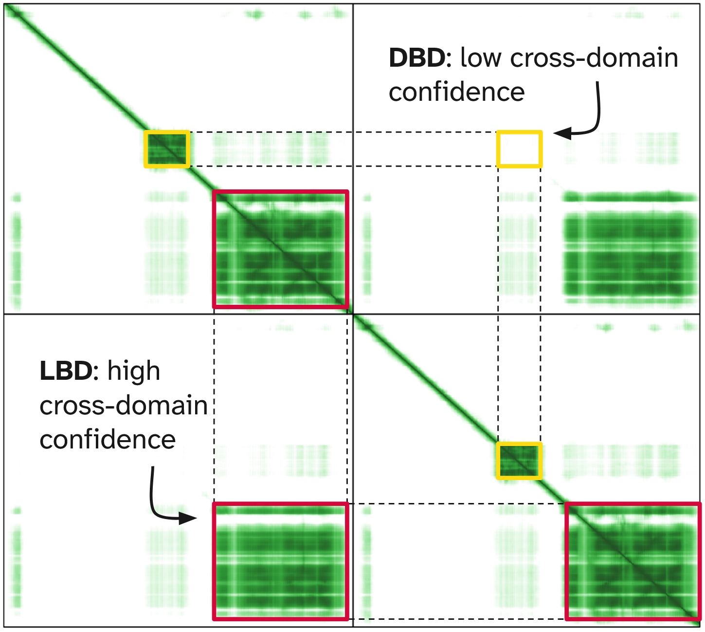 PAE matrix with ligand-binding domain (LBD) highlighted in red and DNA-binding domain (DBD) highlighted in yellow. Note the high cross-PAE for the two DBD domains, indicating uncertainty in their relative positioning.