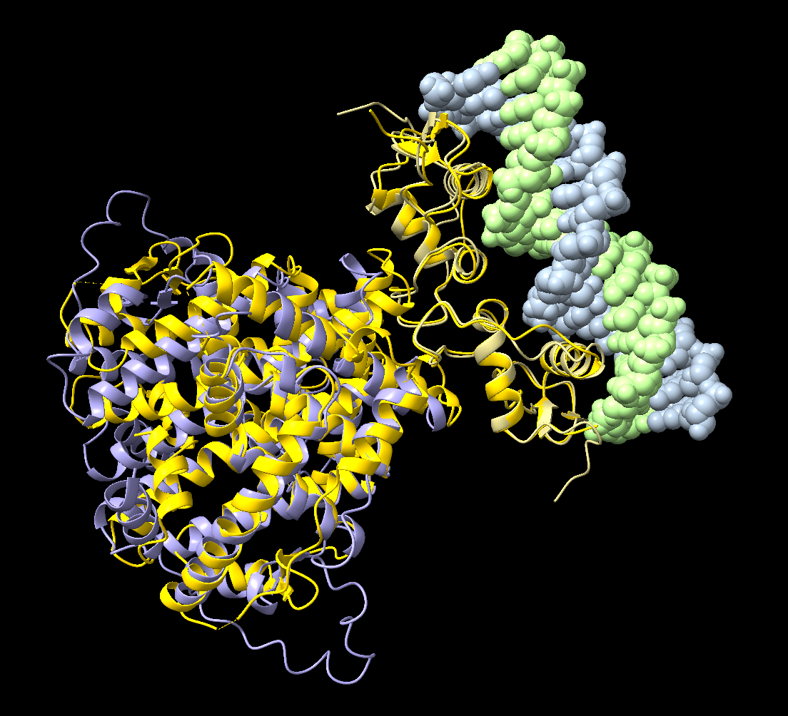 The DNA-binding domains (DBDs) also align well with the human ER structure bound to DNA. In particular, the recognition helices of each DBD are positioned in the DNA major groove in a manner very similar to the experimental structure.