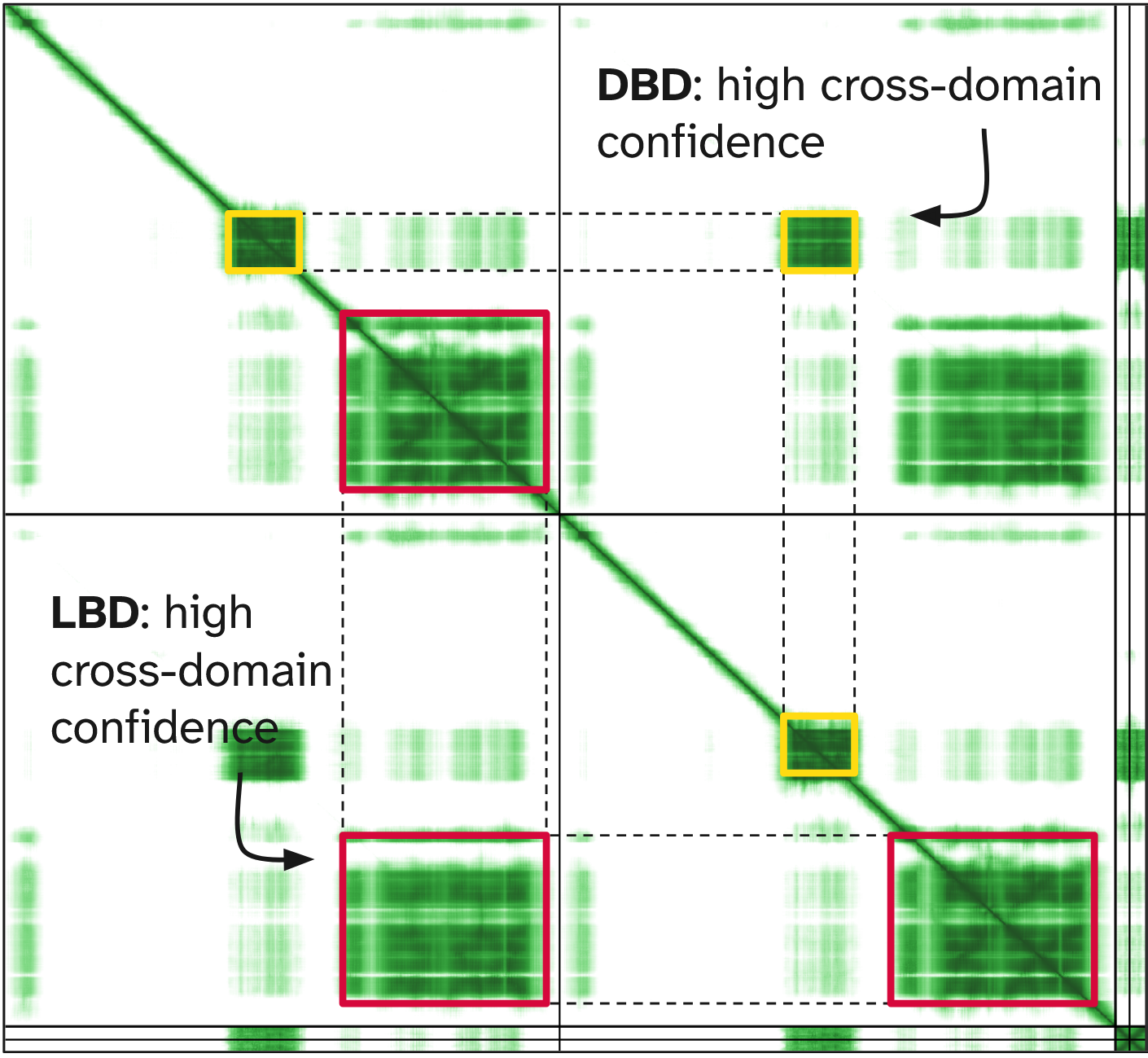 PAE matrix with ligand-binding domain (LBD) highlighted in red and DNA-binding domain (DBD) highlighted in yellow. Note the low cross-PAE for the two DBD domains, indicating confidence in their relative positioning.