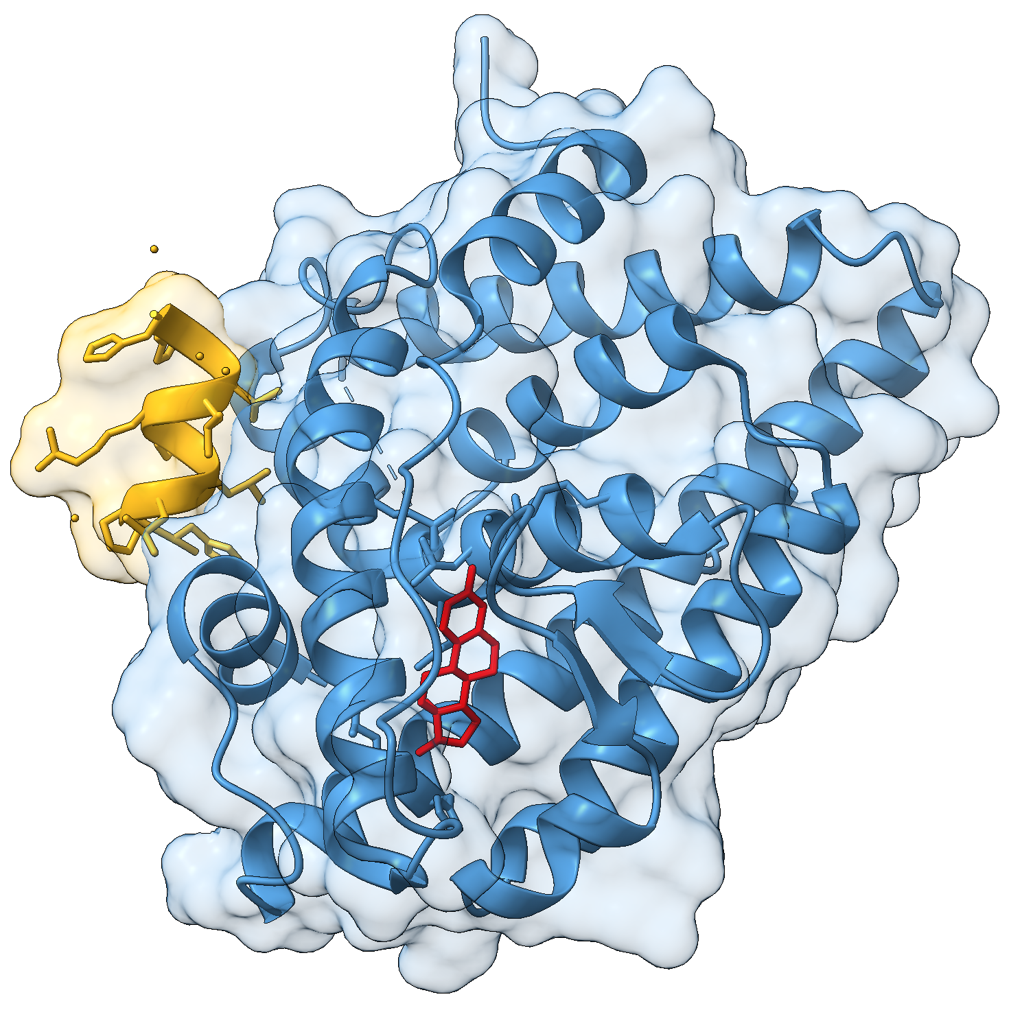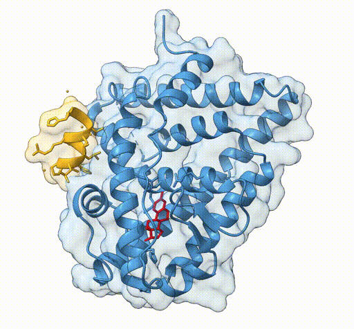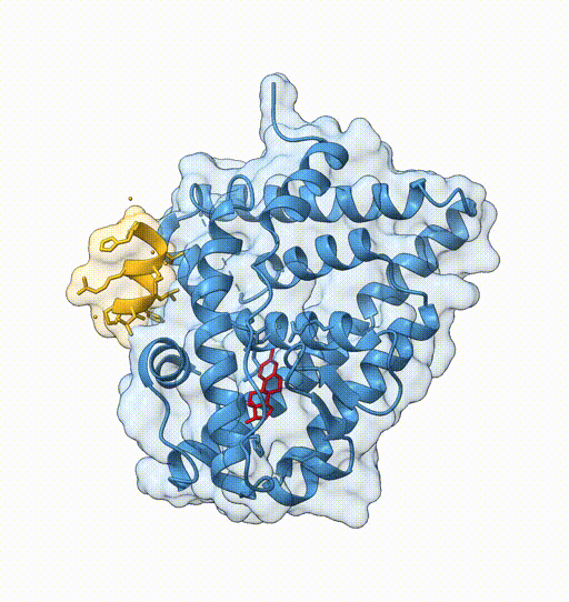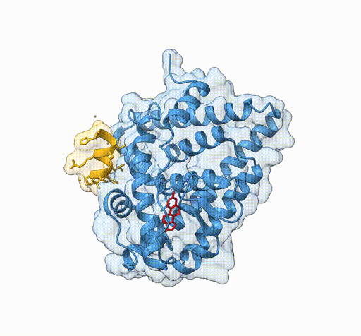 Consider the following view of the estrogen receptor in complex with a conserved peptide motif characteristic of activator proteins (PDB: 4J26).