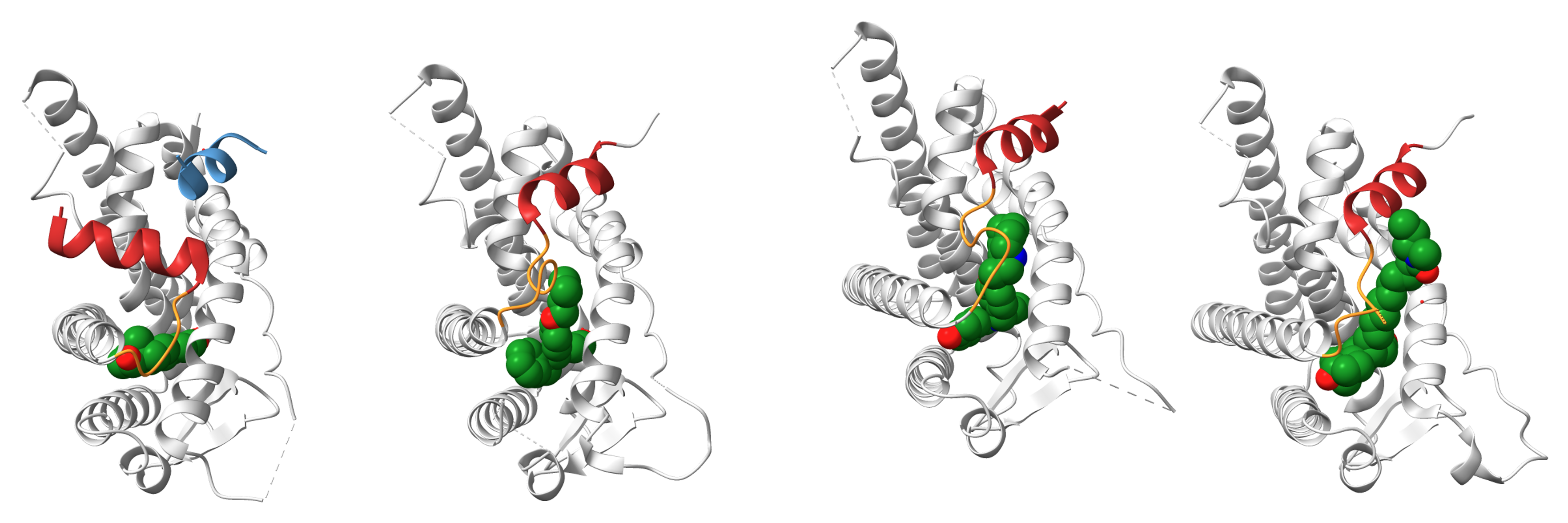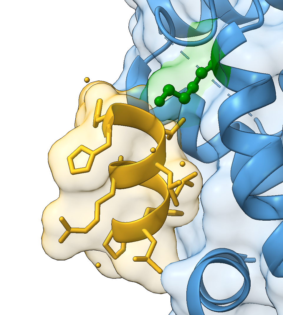 This visualisation combines several features to highlight the interaction between the receptor and the peptide.
